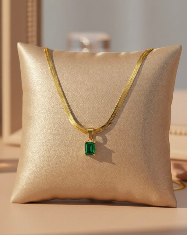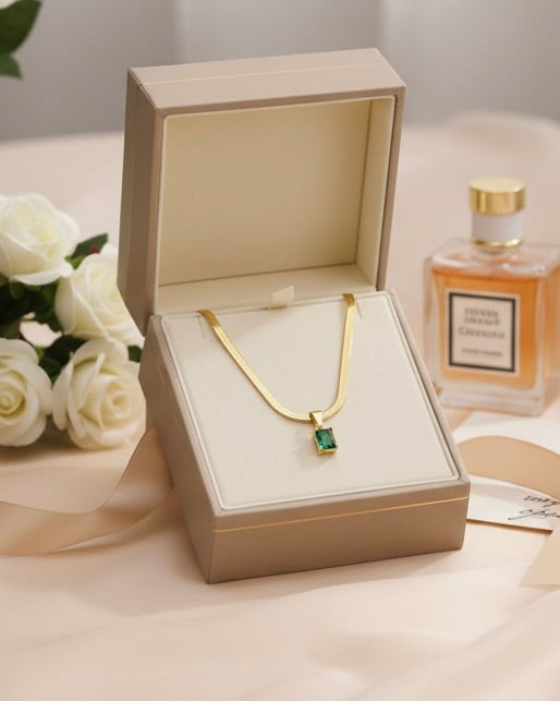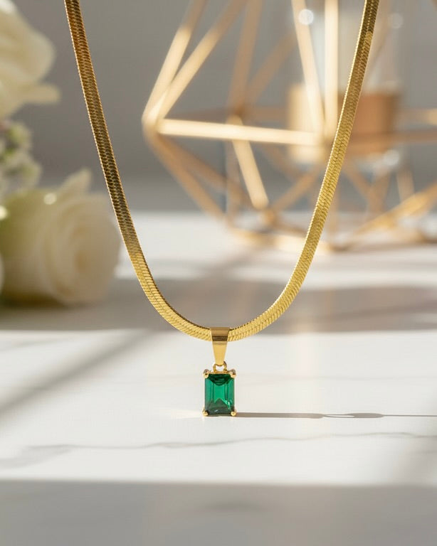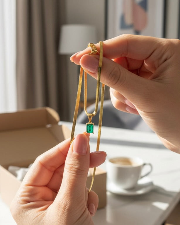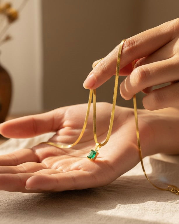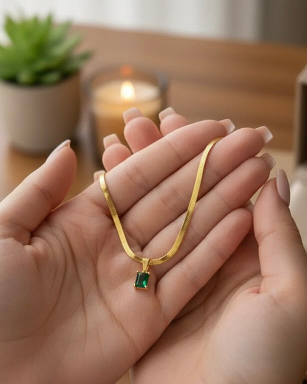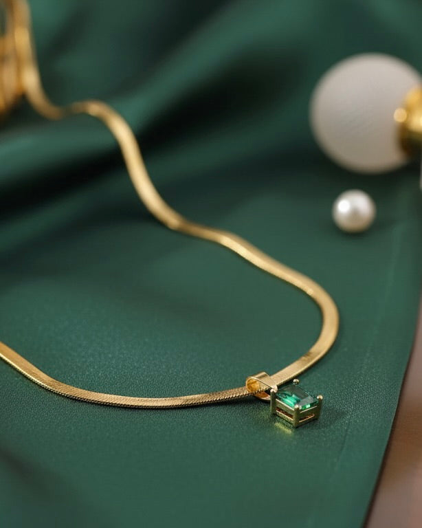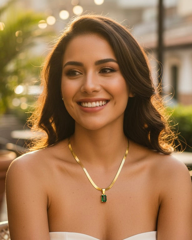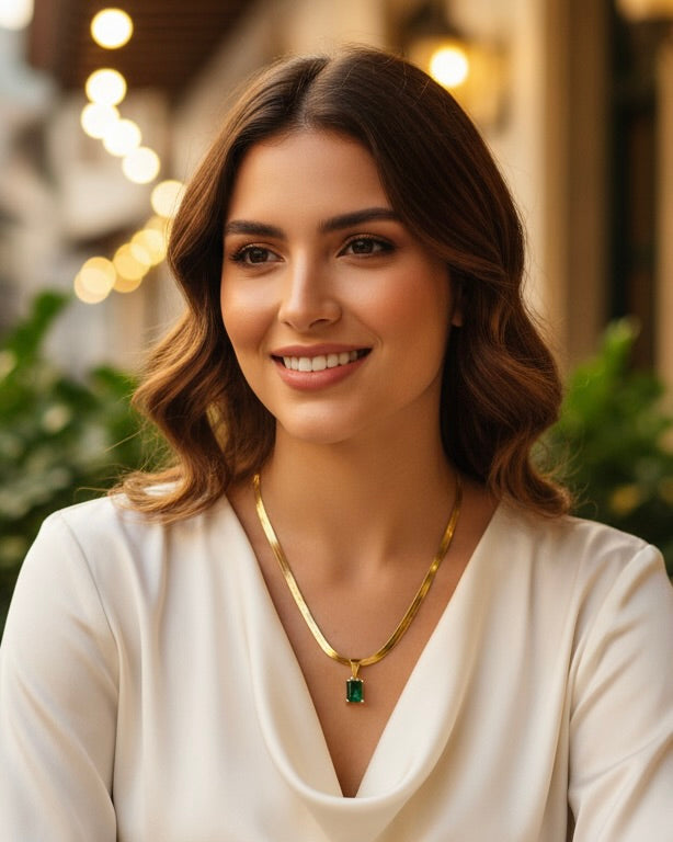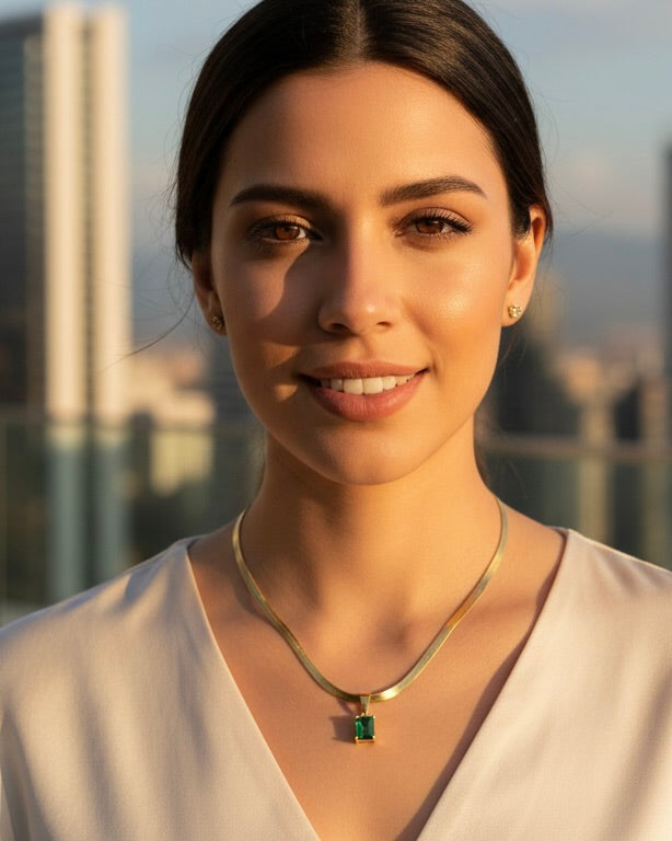 La piedra verde representa crecimiento, éxito y armonía interior — un amuleto moderno para mujeres seguras de sí mismas.